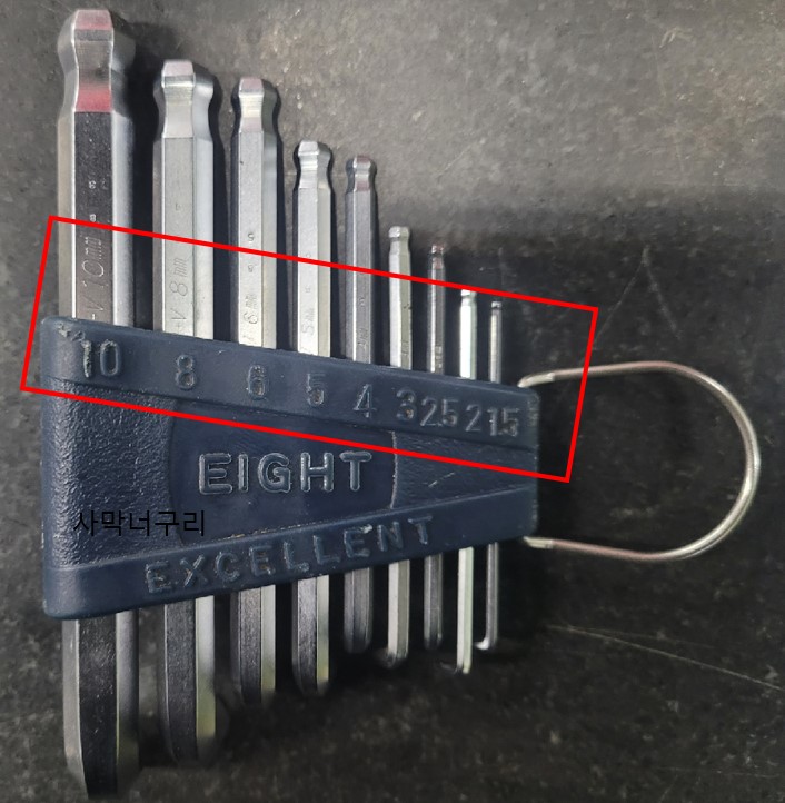 육각렌치에는 크기별로 숫자가 적혀 있는데 이 숫자가 육각렌치 볼트 머리의 넓은 면의 폭과 같습니다.