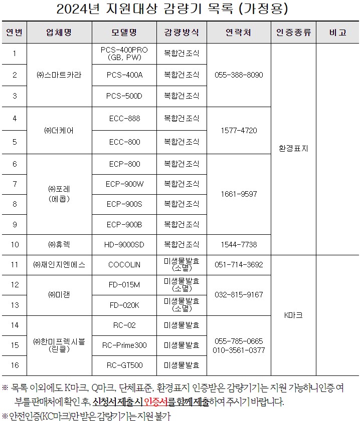 가. 음식물류 폐기물 감량기기 중 가열·건조 또는 미생물 발효처리 등 감량율이 높은 품질인증제품(K마크, Q마크, 단체표준, 환경표지 인증 제품)에 한하여 보조금 지원이 가능하므로 기기 구입 전 인증 여부를 확인하시기 바랍니다.