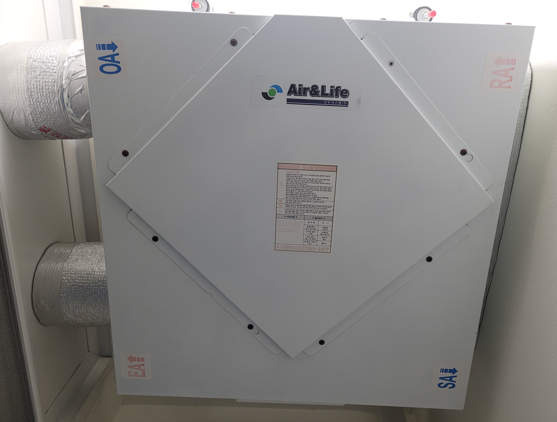 에어컨 실외기 룸 천장에 설치되어 있는 환풍기유니트 (신우시스템이라는 회사에서 제작)