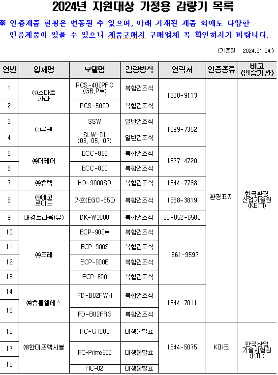 ※ 음식물쓰레기 분쇄하여 하수관으로 배출하는 주방용 오물분쇄기는 인증여부에 관계없이 지원 제외